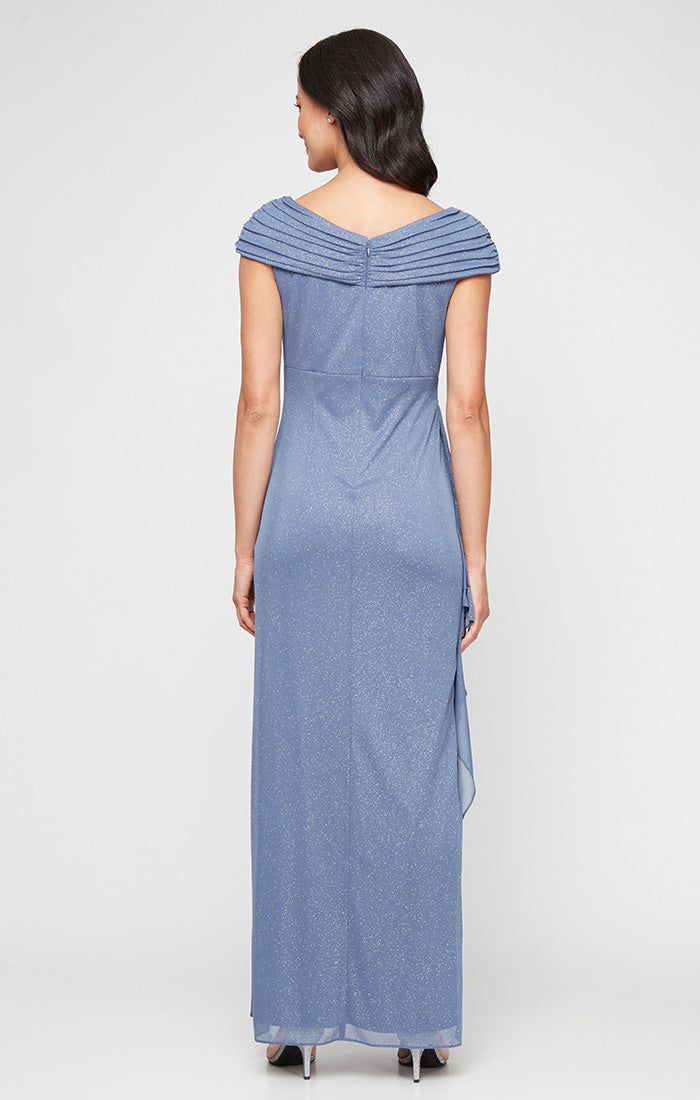 Petite Long Sleeveless L-Neck Dress with Embellished Ruched Neckline and Cascade Detail Skirt