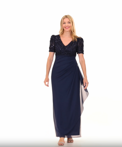 Expertly crafted, this long empire waist dress showcases a stunning soutache bodice and elegant puff sleeves. The cascade ruffle skirt adds a touch of romance to this sophisticated piece. Perfect for formal or special occasions.