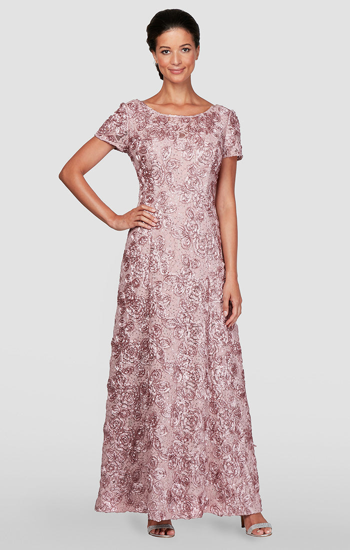 Grace every special occasion in this Petite A-line gown, designed with dimensional rosette lace that offers both texture and shimmer. Subtle sequins catch the light beautifully, while short illusion sleeves provide delicate coverage with a touch of romance. The flattering A-line silhouette elongates the frame, making it especially suited for petite proportions.