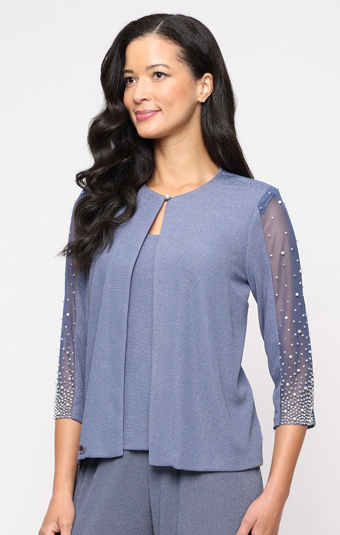 3/4 Sleeve Metallic Knit Mock Twinset with Heat Set Illusion Bell Sleeves and Hook Neck Closure