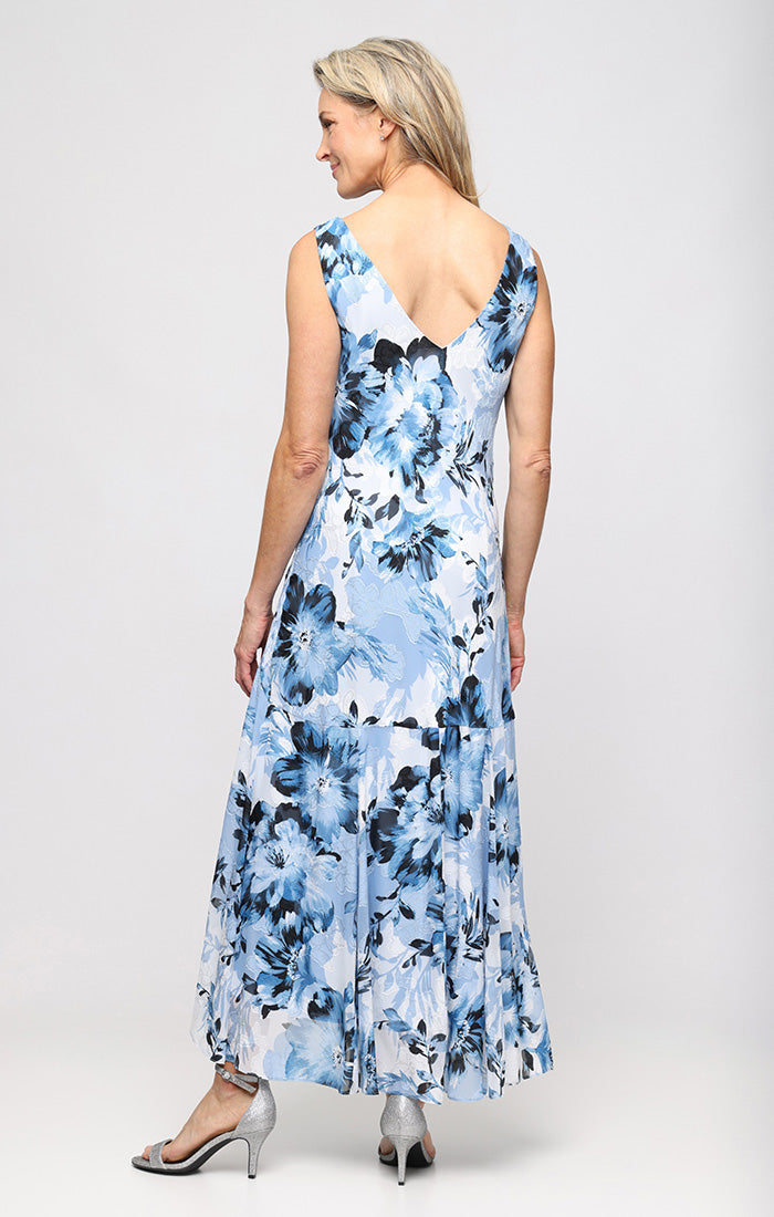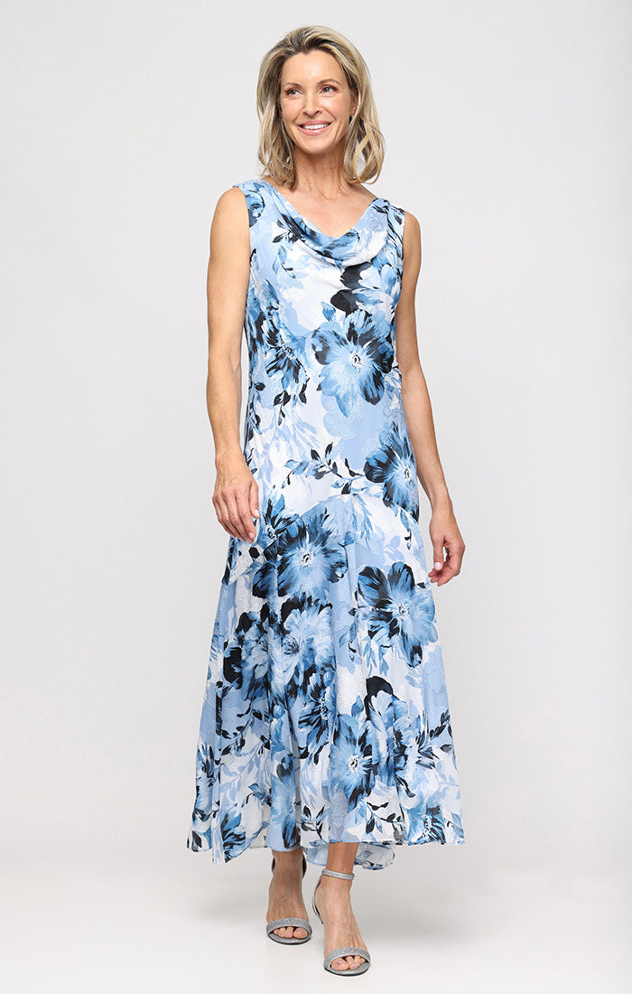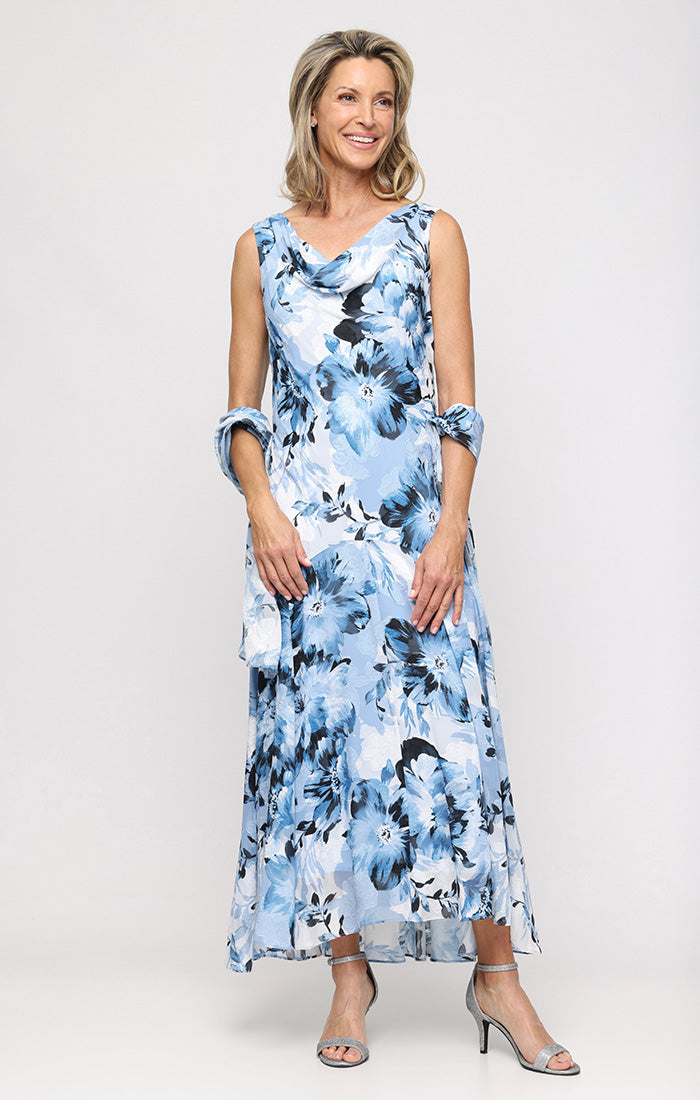 Sleeveless Printed Burnout Chiffon Dress with Cowl Neckline, Tulip Overlay High/Low Hem and Shawl