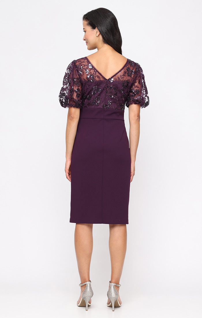 Short Stretch Crepe Sheath Dress with Embroidered Bodice, Illusion Neckline and Bubble Hem Elbow Sleeves