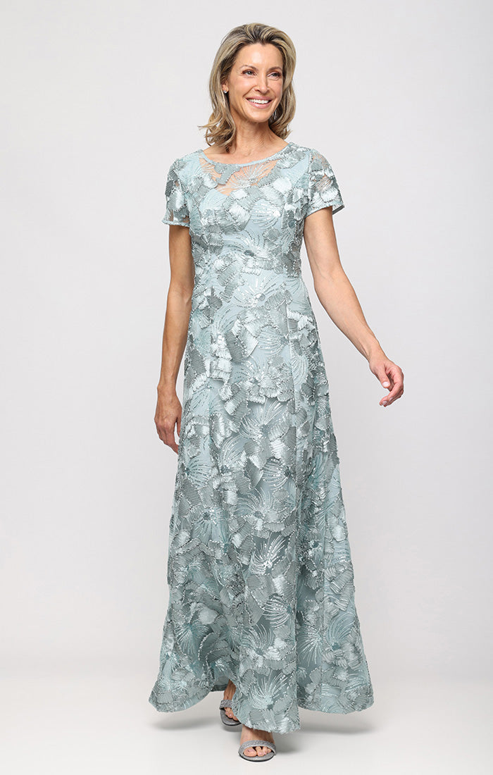 Twirl into the spotlight in this stunning long A-line dress that's pure elegance with a playful twist. The delicate illusion neckline adds an enchanting touch of sophistication, while short sleeves keep things comfortable and chic.