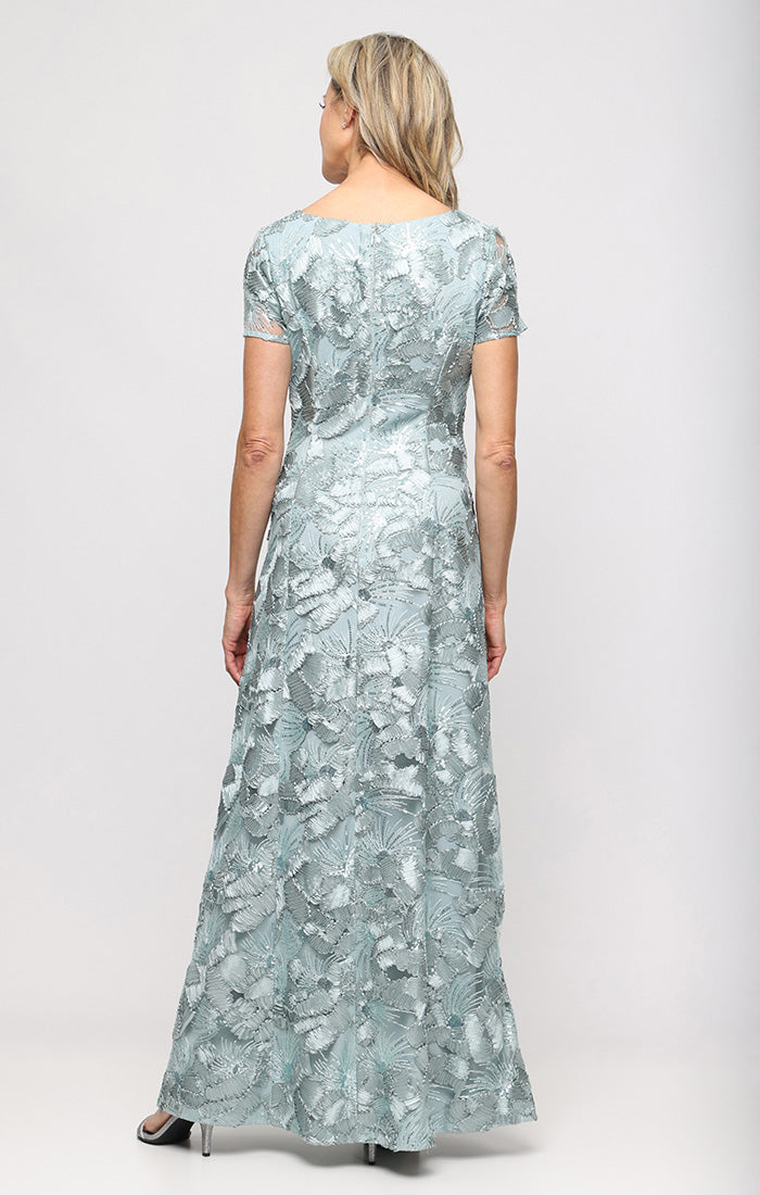 Long Soutache A-Line Dress with Short Sleeves and Illusion Neckline