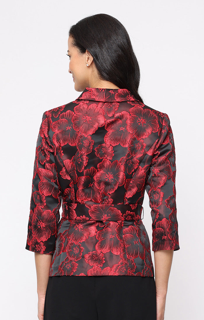 This 3/4 sleeve jacquard blouse features a structured collar and a center front button closure for a polished look. The tie waist accentuates your silhouette, offering a tailored fit that enhances your style. Crafted from jacquard fabric, it combines texture with elegance, making it a versatile piece for both professional and casual settings.