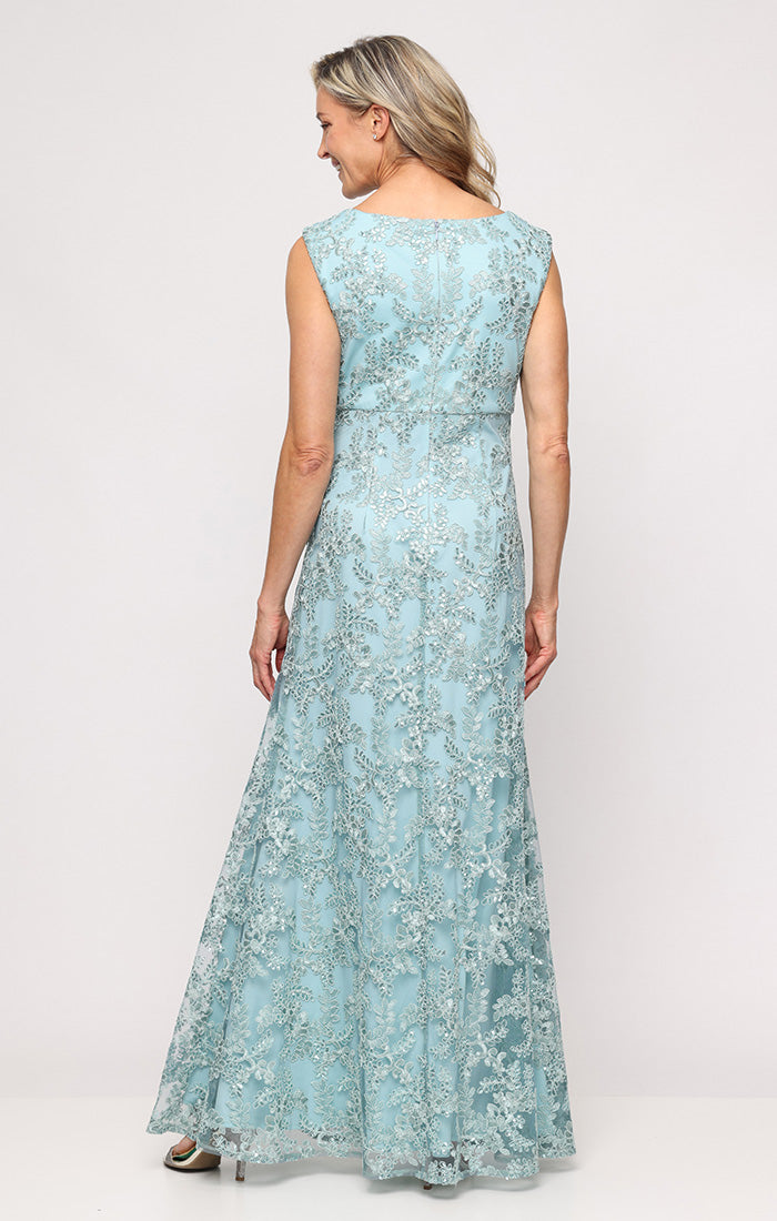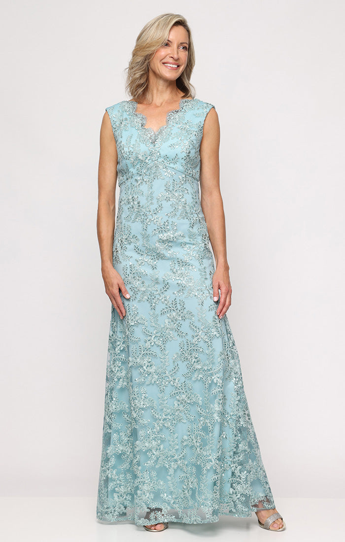 Long Embroidered Empire Waist Dress with Scallop Detail V-Neckline