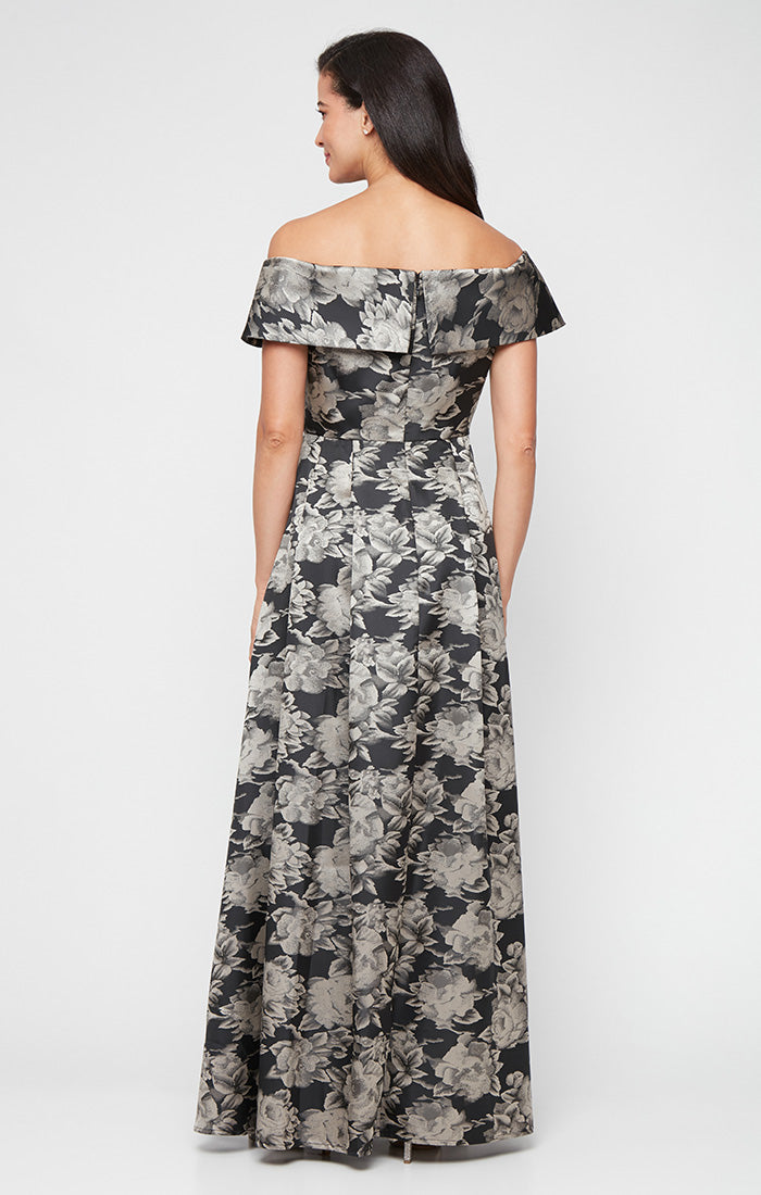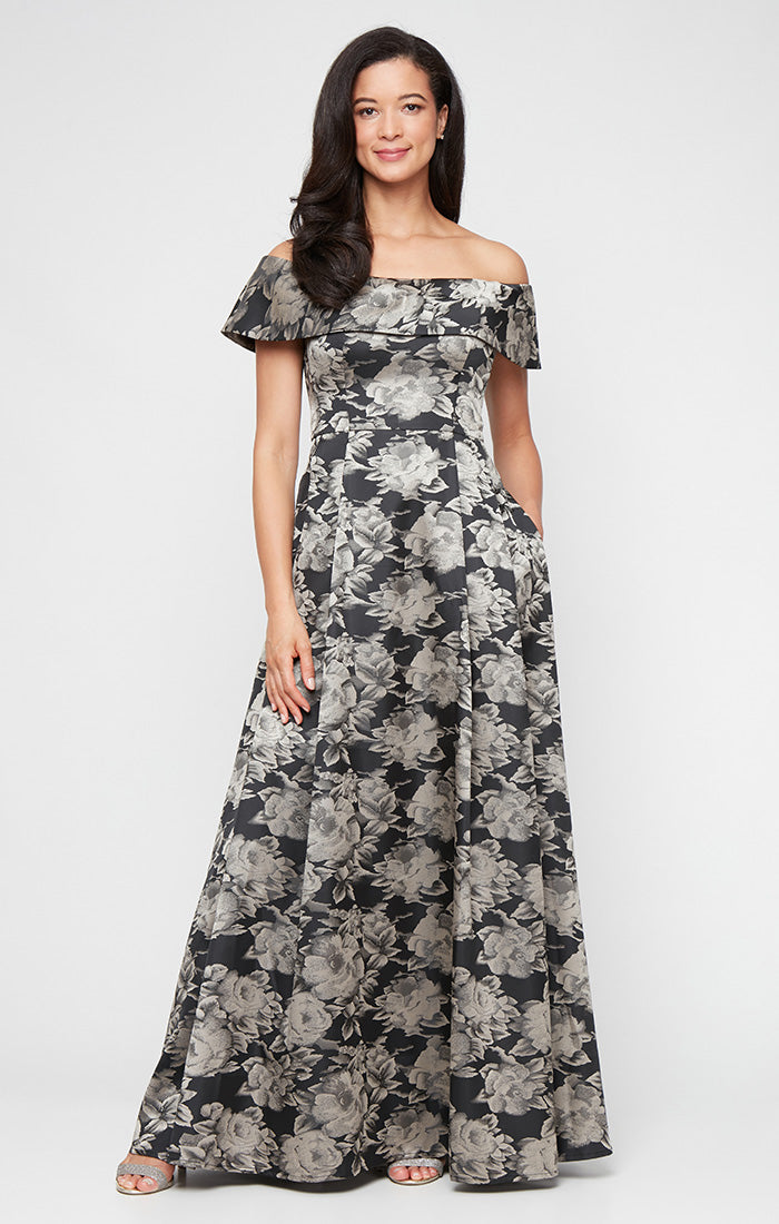 Step into the spotlight with this Long Printed Off The Shoulder Jacquard Ballgown. Its elegant off-the-shoulder design pairs beautifully with the rich jacquard fabric, while the playful print adds a charming twist. Feel like the belle of any ball while embracing timeless style with a modern flair.