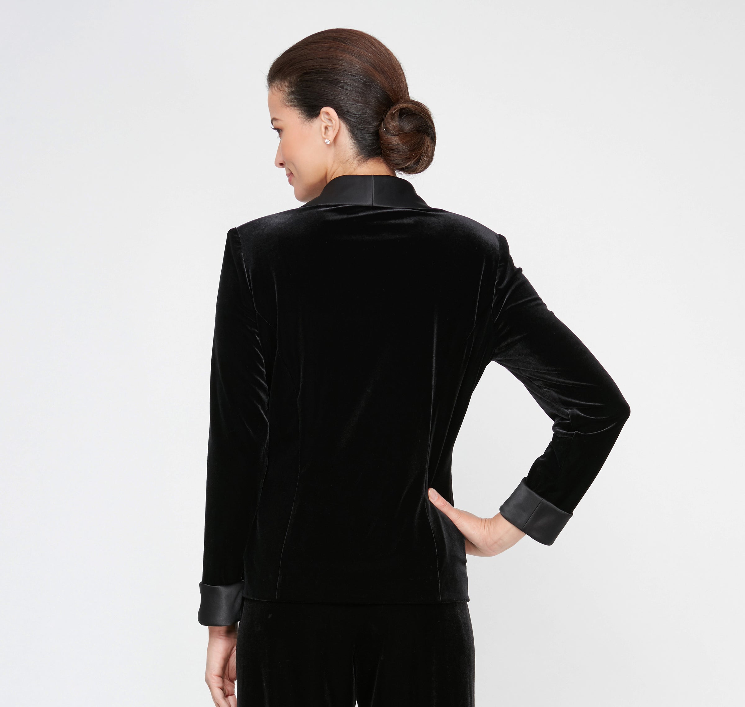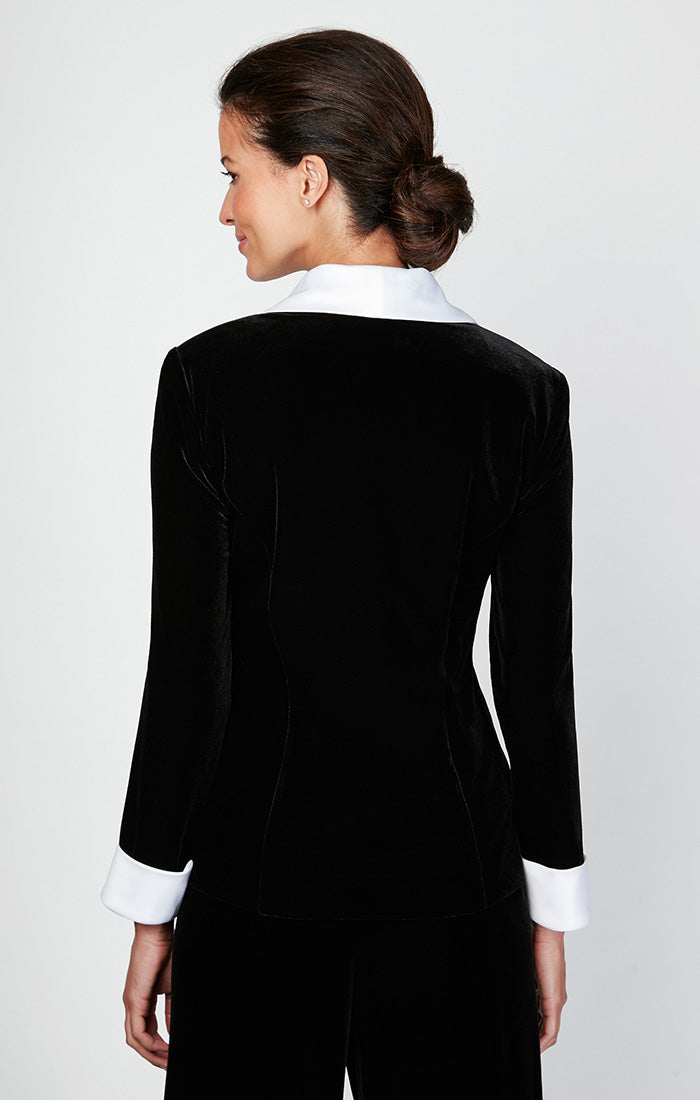 This elegant velvet twinset is designed with contrasting satin collar and cuffs, featuring a decorative clasp closure on the jacket that adds a sophisticated touch.