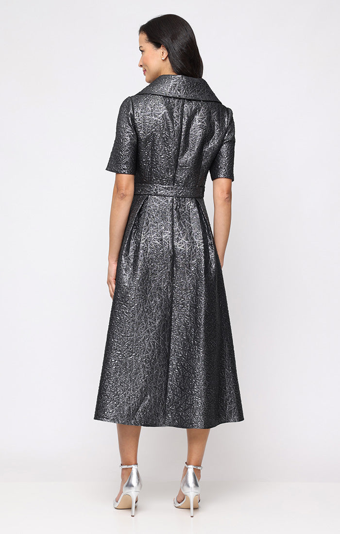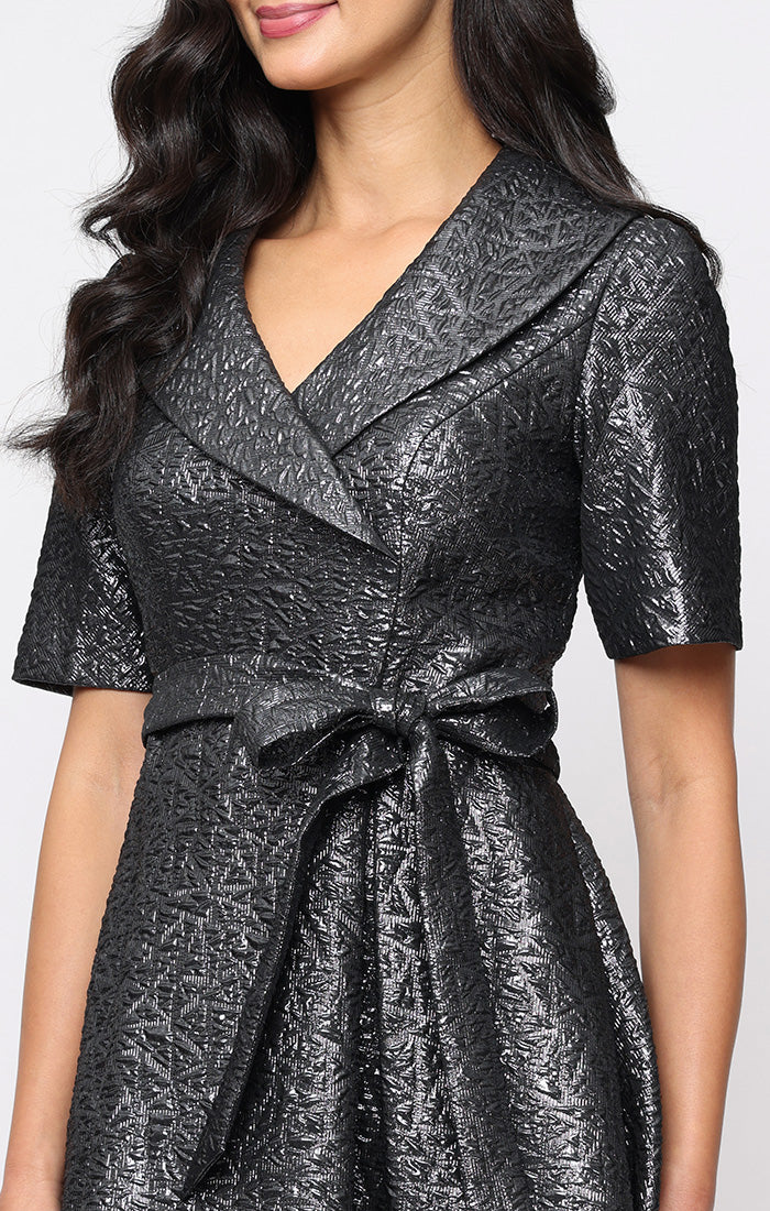 This midi dress features a textured jacquard fabric that adds depth and sophistication to its design. The A-line silhouette flatters a variety of body shapes, while the collar and tie waist provide adjustable structure and a polished finish. Ideal for elegant occasions, this dress combines classic tailoring with subtle detailing for a refined look.