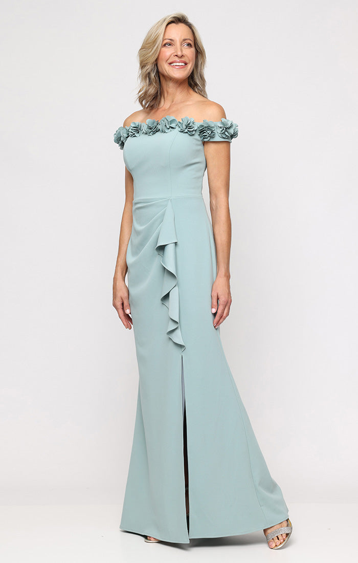 *Long Off the Shoulder Dress With 3D Flower Neckline and Front Slit