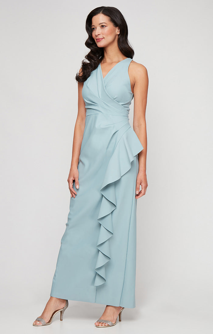 *Long Sleeveless Contour Collection Dress with Surplice Cutaway Halter Neckline and Cascade Ruffle Detail Skirt