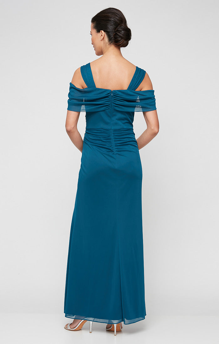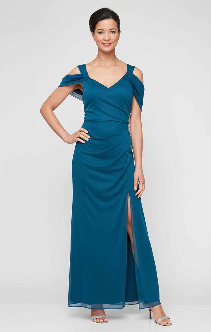 Long Cold Shoulder Mesh Dress with Surplice Neckline & Beaded Detail at Hip