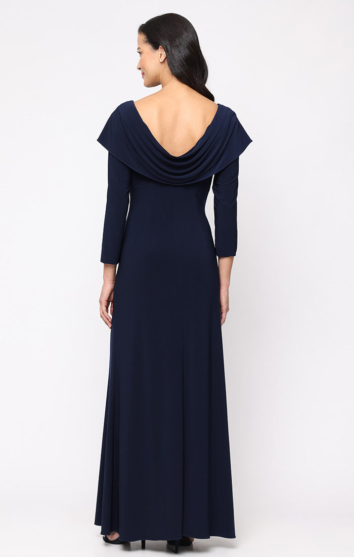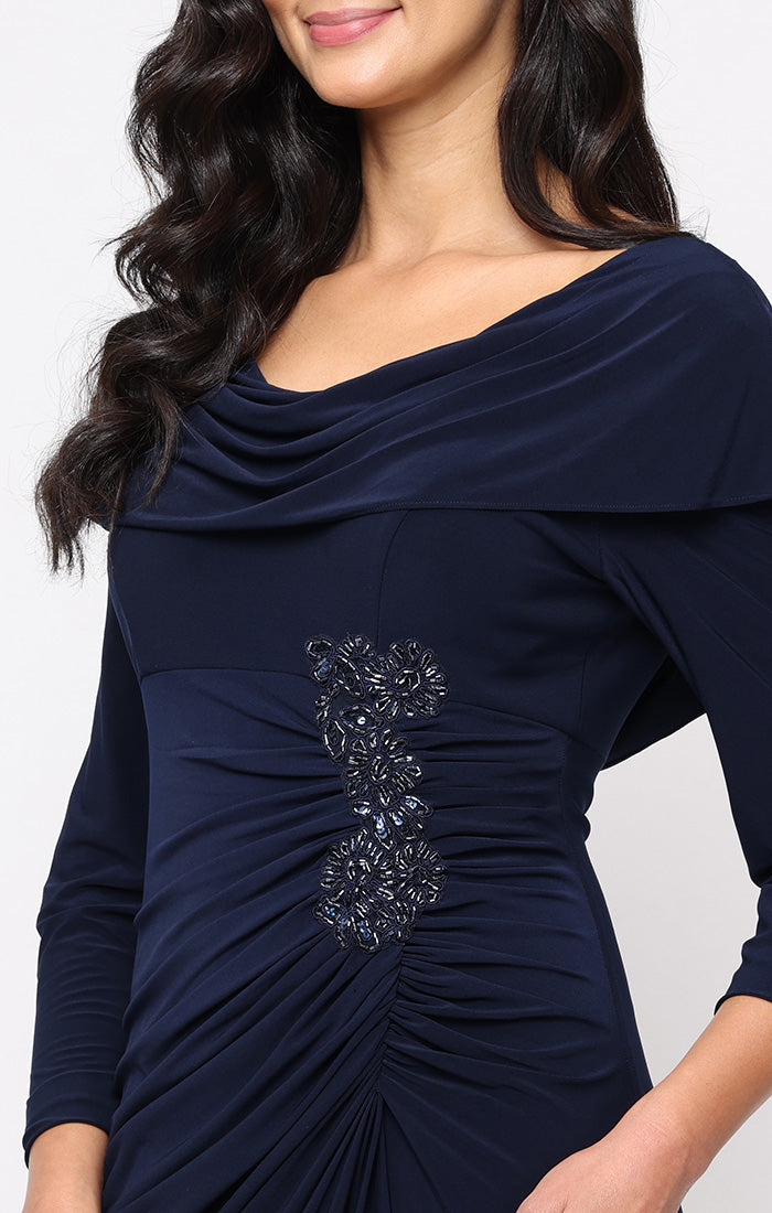 Matte Jersey Dress with Cowl Front, Embellished Ruched Waist and Cowl Back Detail