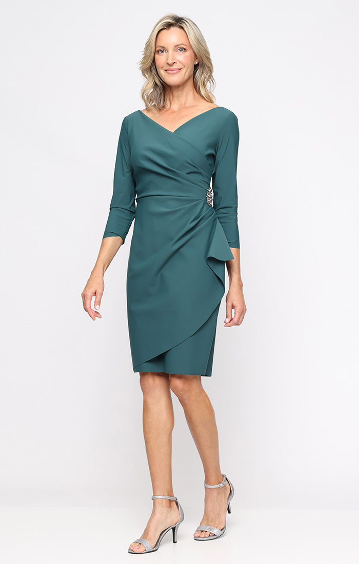 Short Contour Dress with Beaded Hip Detail, 3/4 Sleeves & Cascade Ruffle Detail