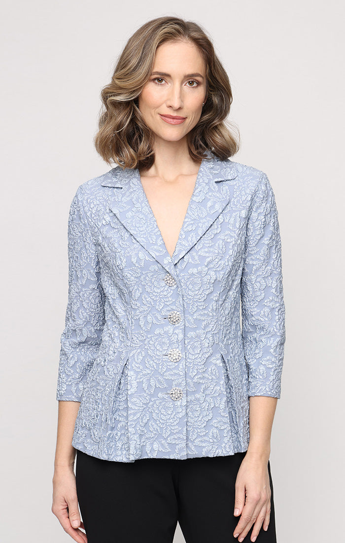 The three-quarter sleeves hit just right for effortless sophistication, while the crisp button front closure and structured collar keep things polished and put-together. Rich jacquard detailing adds visual interest and texture that elevates any outfit from ordinary to extraordinary.
