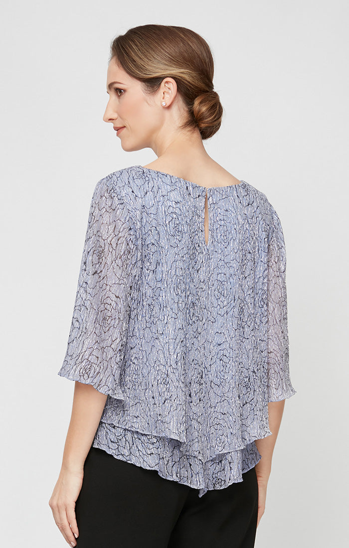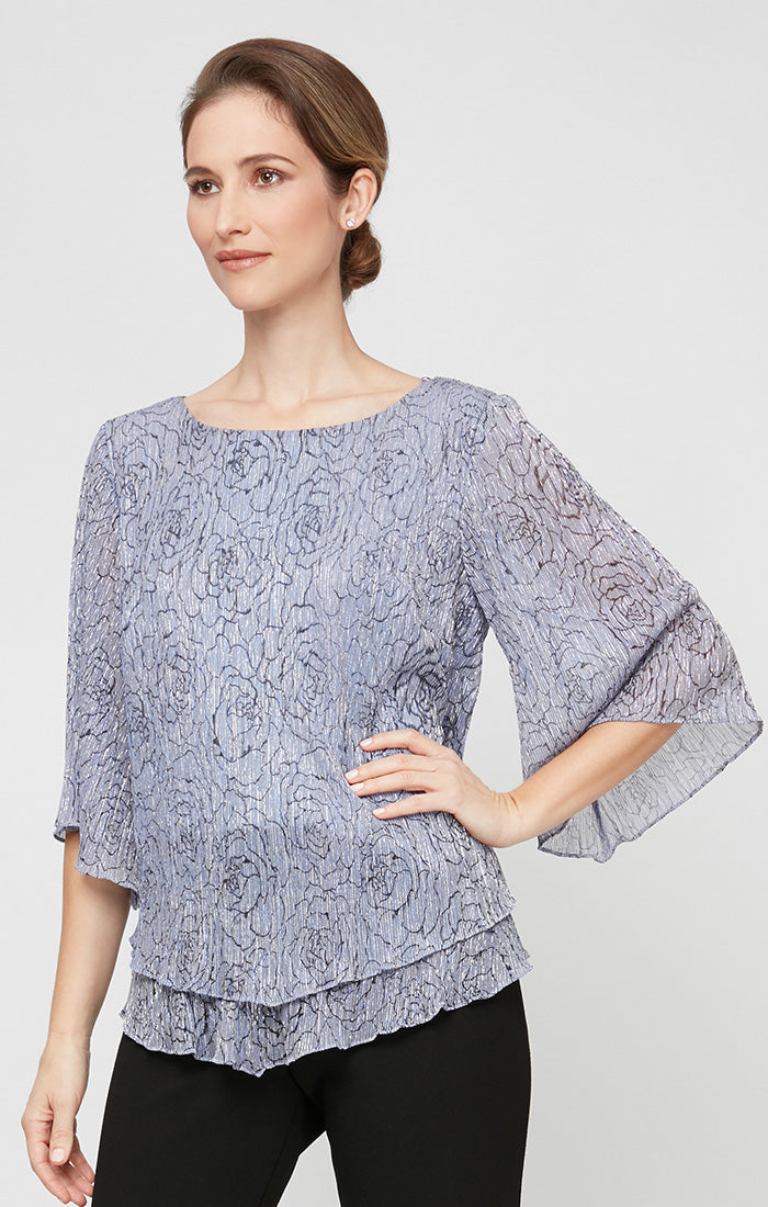 Stylish, shimmering, sheer 3/4 sleeves and a pointed double tier hem make this blouse comfortable and flattering.