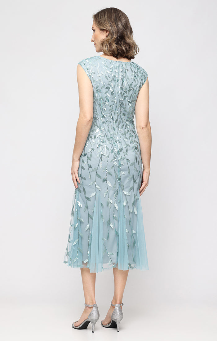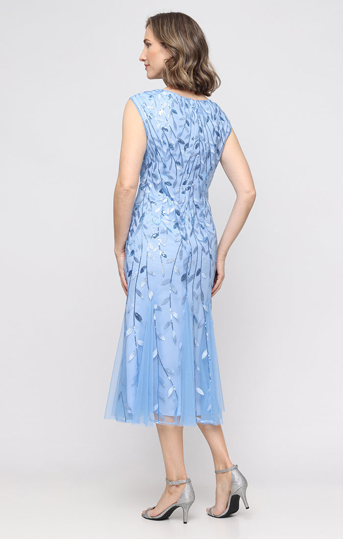 Midi Embroidered Dress with Illusion Neckline and Godet Detail Skirt