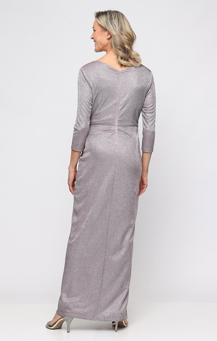 *Long Metallic Knit Dress with Surplice Neckline and Ruched Waist Detail