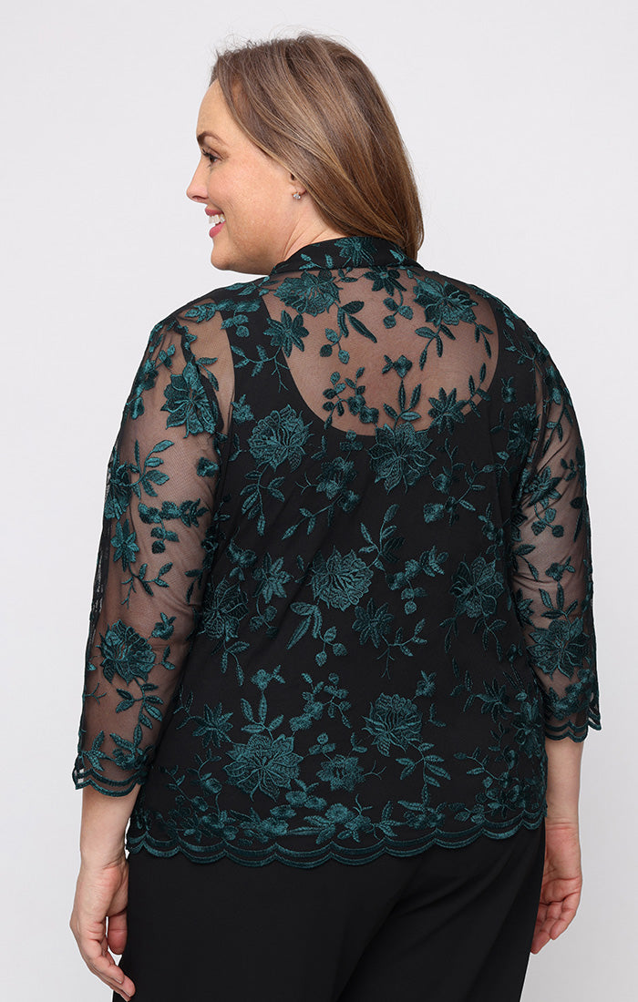 This charming twinset pairs a 3/4 sleeve embroidered lace jacket with a solid scoop neck tank for a layered look that’s effortlessly elegant. Perfect for mixing and matching, it adds a playful pop to your formal wardrobe.