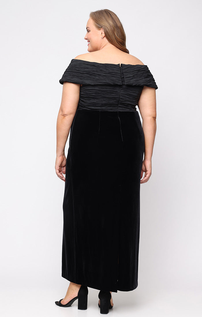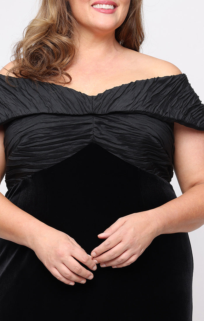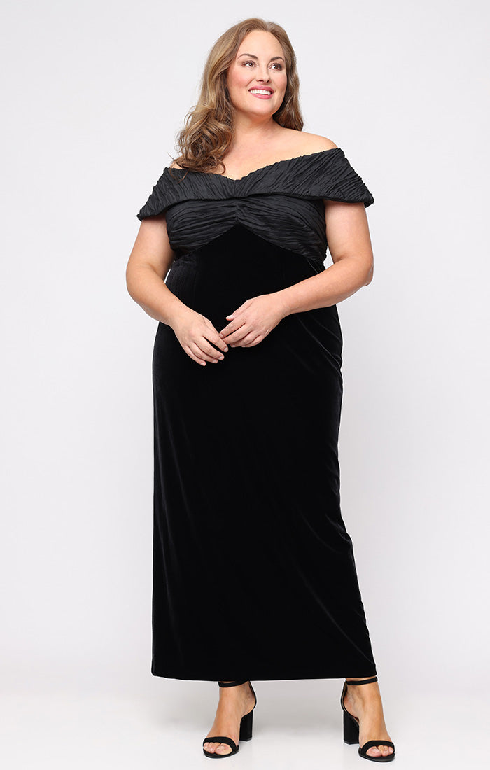 This long stretch velvet sheath plus size dress features a sophisticated off-the-shoulder neckline accented with a taffeta twist, combining luxurious textures for an elegant look.