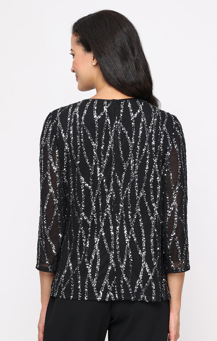 Sparkle with ease in this plus twinset featuring 3/4 length powermesh sleeves adorned with shimmering sequins. The attached hook neck jacket adds a chic, mock-layered look that’s both stylish and comfortable, perfect for turning everyday moments into celebrations.