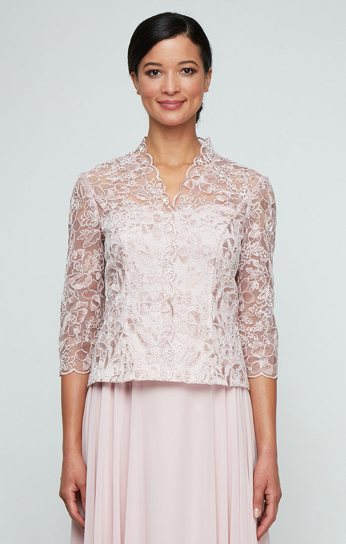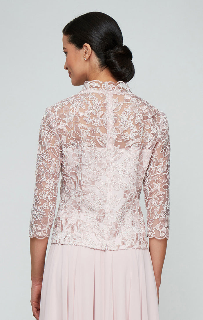 Petite - 3/4 Sleeve Corded Embroiderey Blouse with Center Front Scallop Detail and Illusion Sleeves