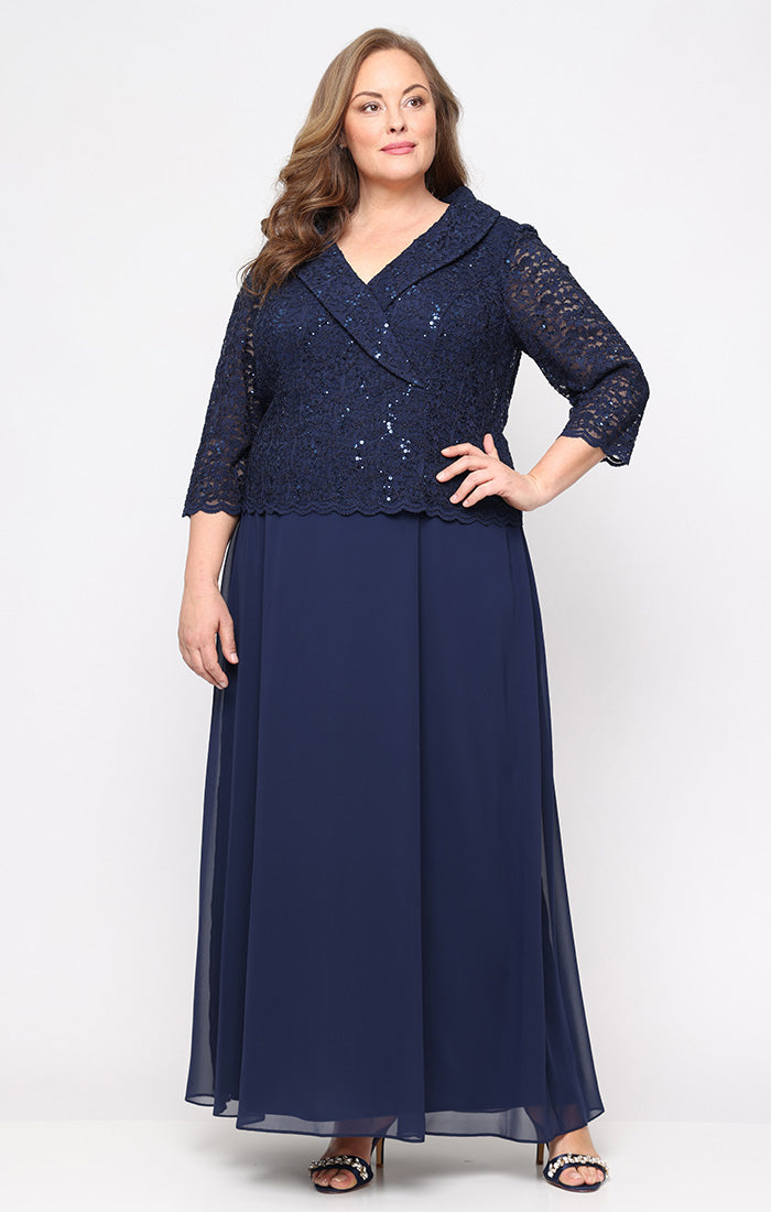 Plus - Long Stretch Lace Mock Dress with Portrait Collar Neckline and Chiffon Skirt