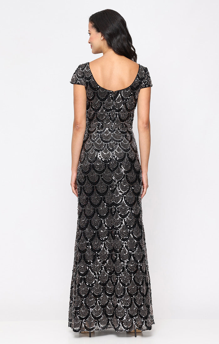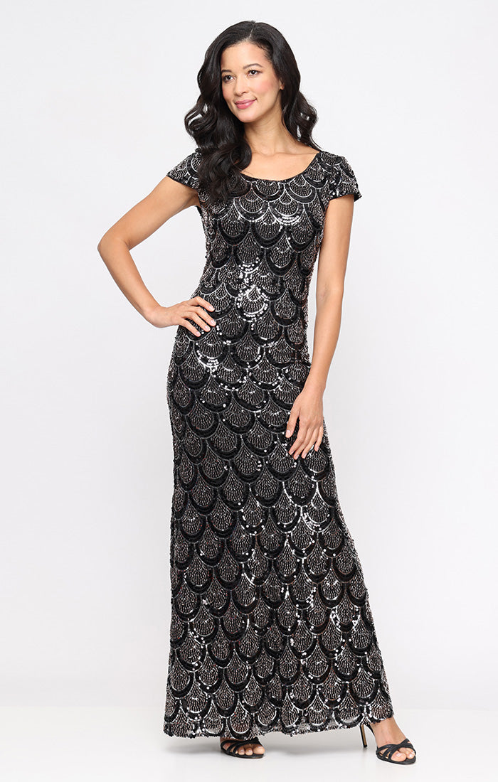 Long Cap Sleeve Sequin Dress with Scoop Neckline
