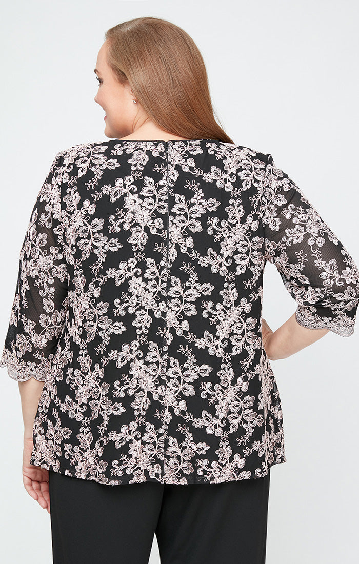 Plus 3/4 Sleeve Embroidered Mock Twinset with Scallop Detail