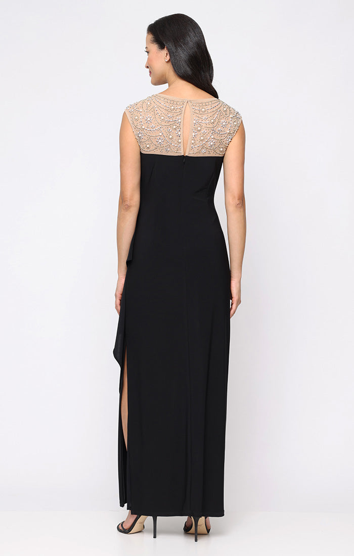 Petite Long Matte Jersey Dress with Heat Set Illusion Neckline and Cascade Detail Skirt