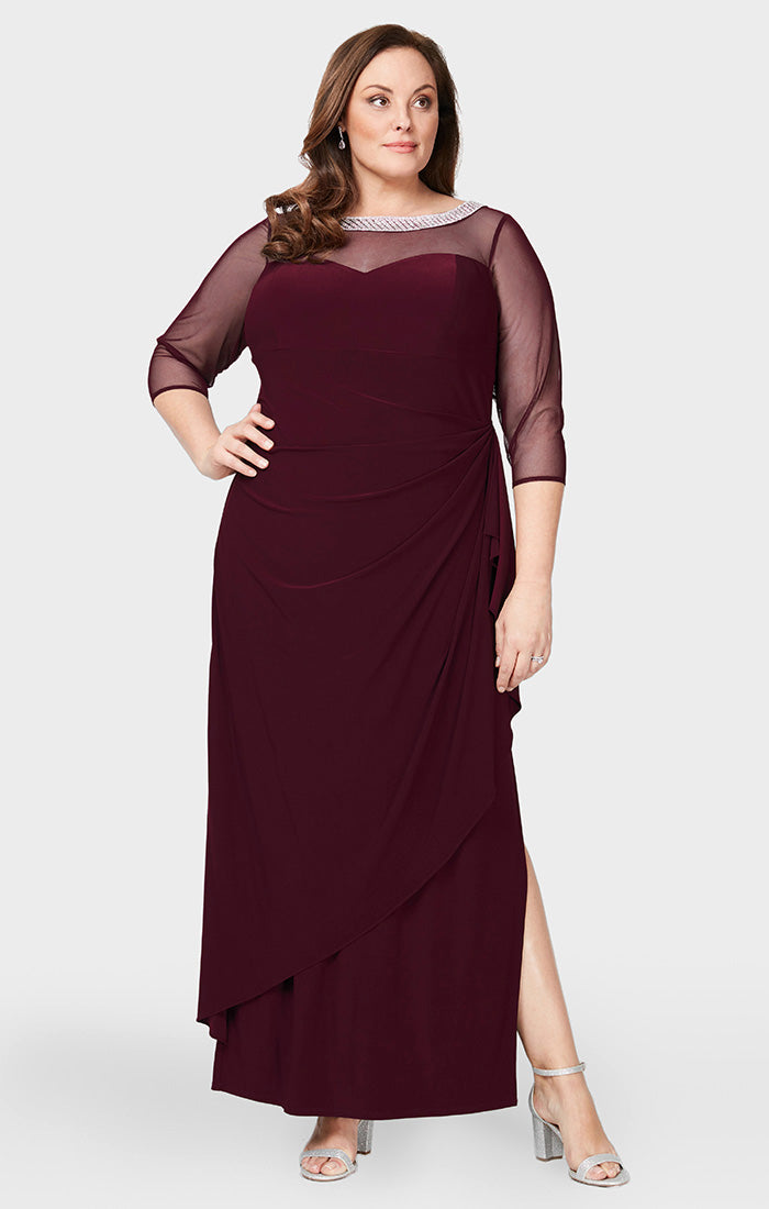 This elegant dress features a long matte jersey fabric with an illusion neckline and 3/4 sleeves. The side ruching flatters the figure and is perfectly accented by the embellished neckline. Perfect for a special occasion or a night out, this dress combines style and comfort for a flawless look.