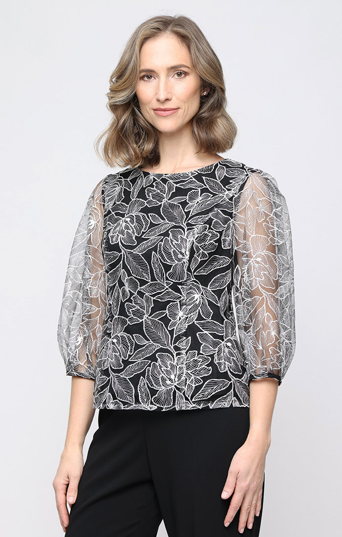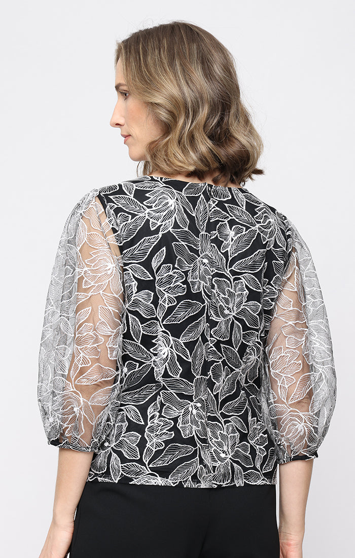 Embroidered Tulle Blouse with Bubble Hem Sleeves with Puff Shoulder Detail