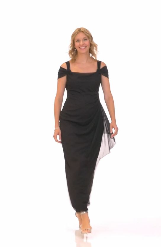 Cold Shoulder Mesh Gown with Cowl Neckline & Overlay Skirt