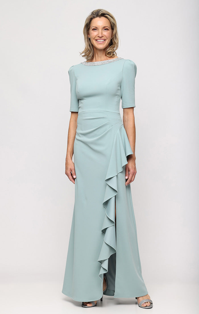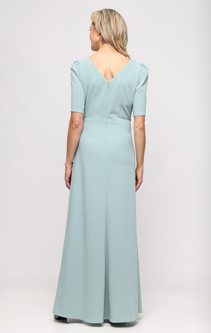 Embellished Stretch Crepe Dress with Elbow Sleeves and Cascade Detail Skirt