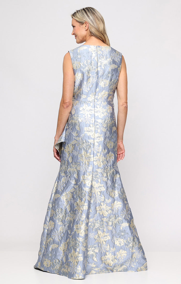 This stunning sleeveless gown combines architectural design with luxurious fabrication. The square neckline frames the shoulders beautifully, while printed jacquard fabric delivers sophisticated pattern and texture throughout. A gracefully cascading skirt creates dramatic movement and dimension, elevating the overall silhouette with refined elegance.