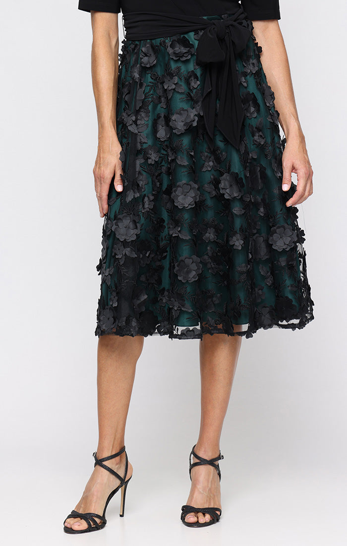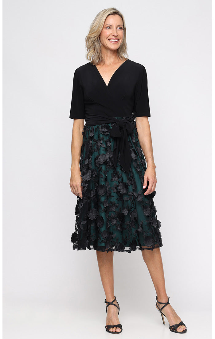 Midi A-Line Dress with 3-D Flower Skirt, Surplice Jersey Bodice, Elbow Sleeves and Tie Waist